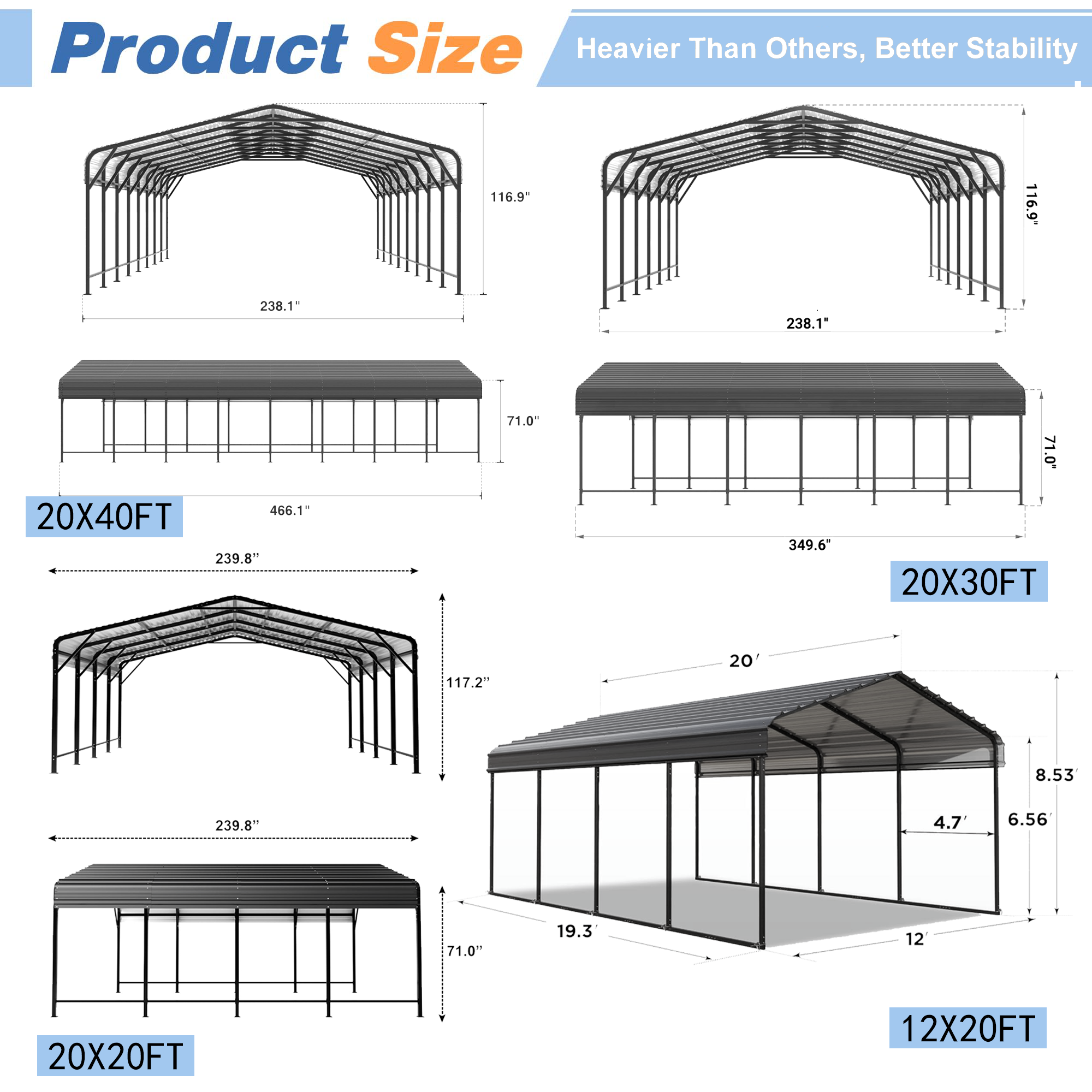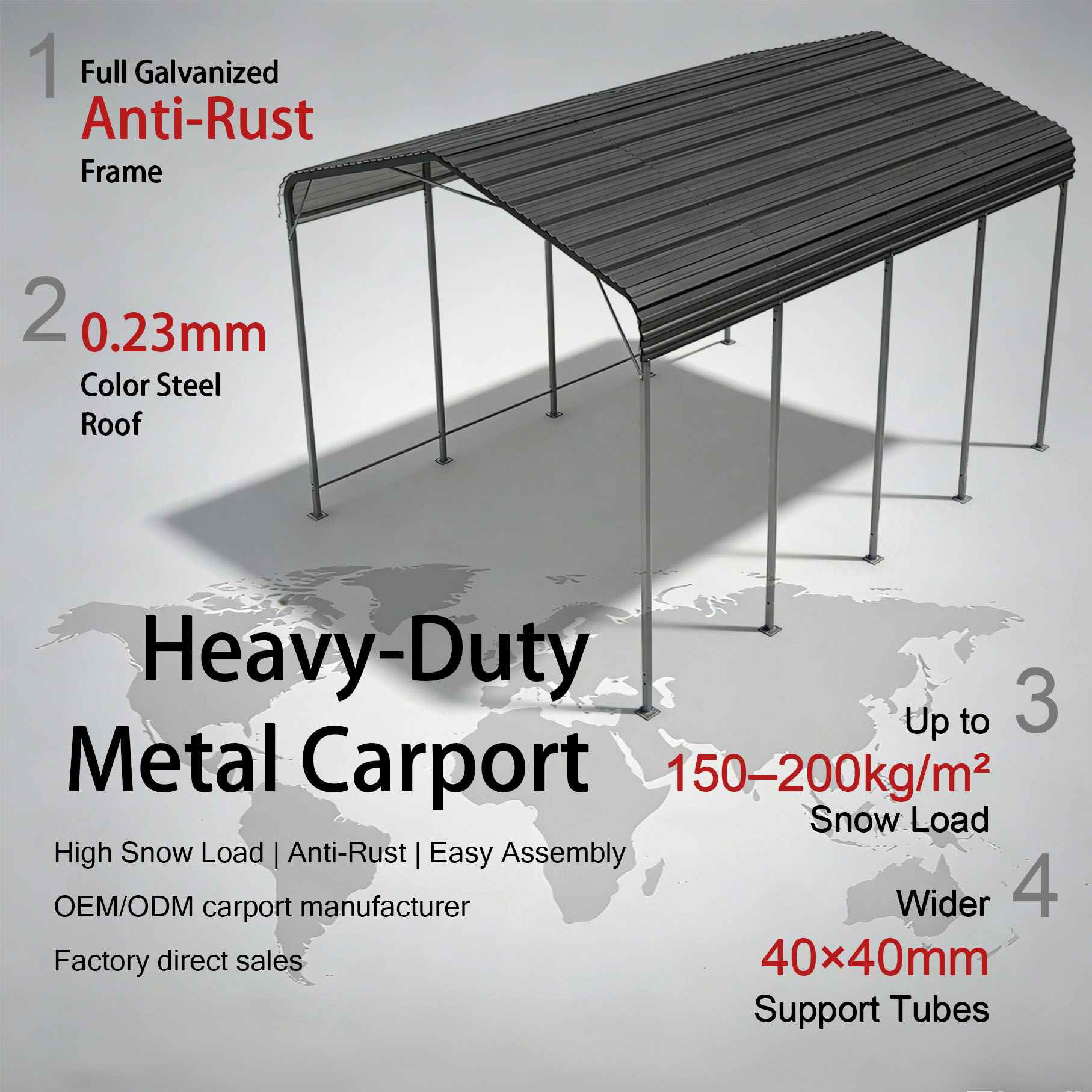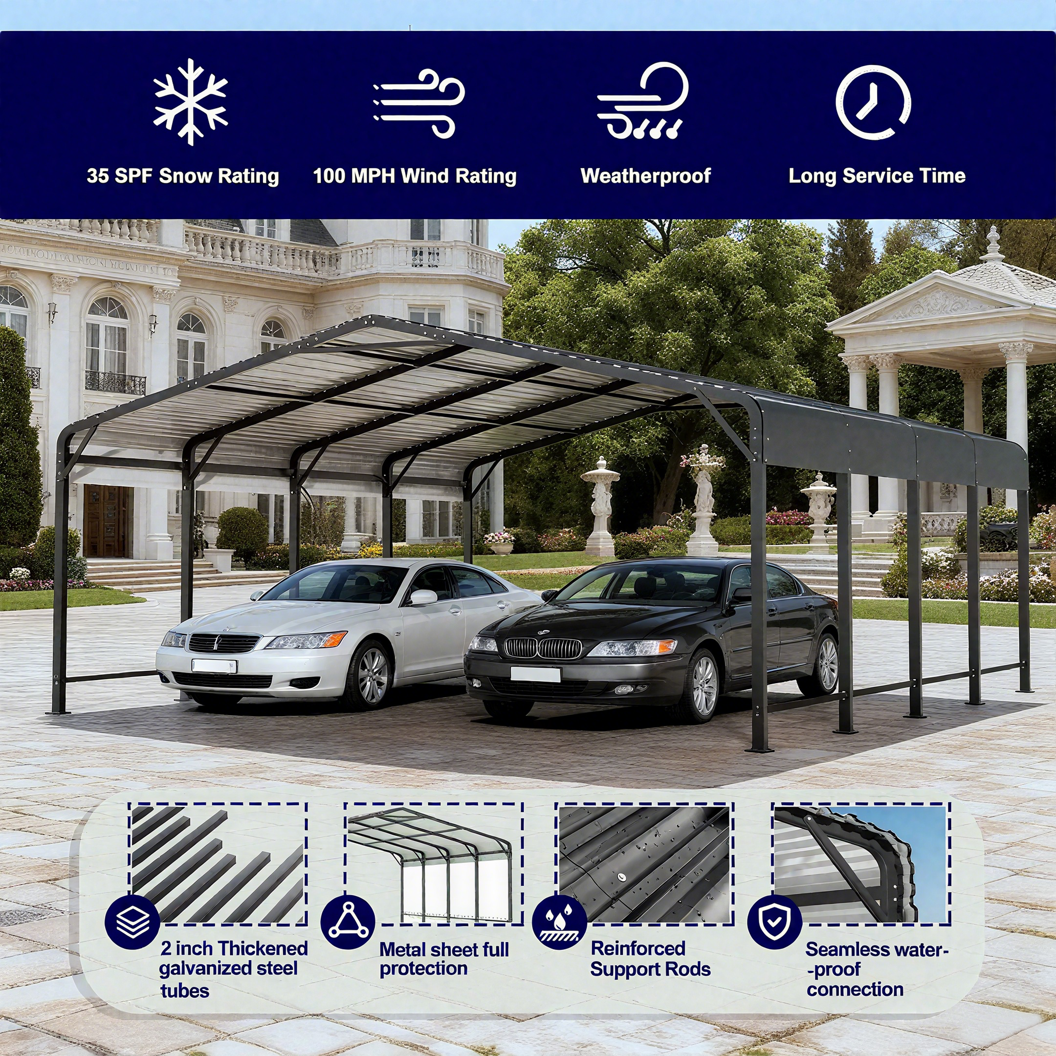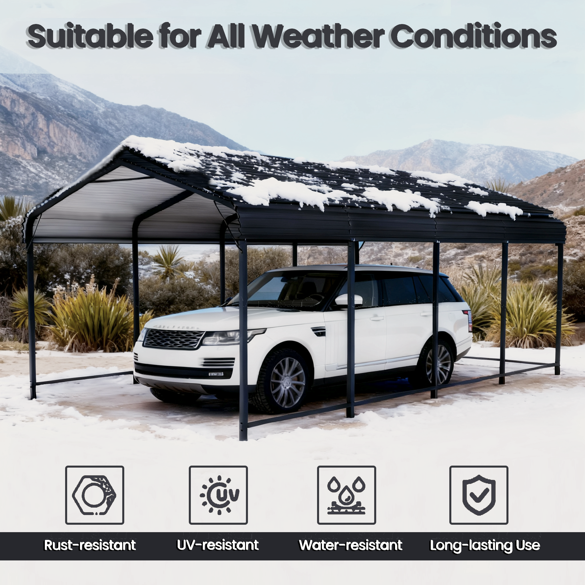 A: Our metal carport uses galvanized square steel tubing with corrosion-resistant coating, designed for heavy duty carport applications and long-term outdoor protection.