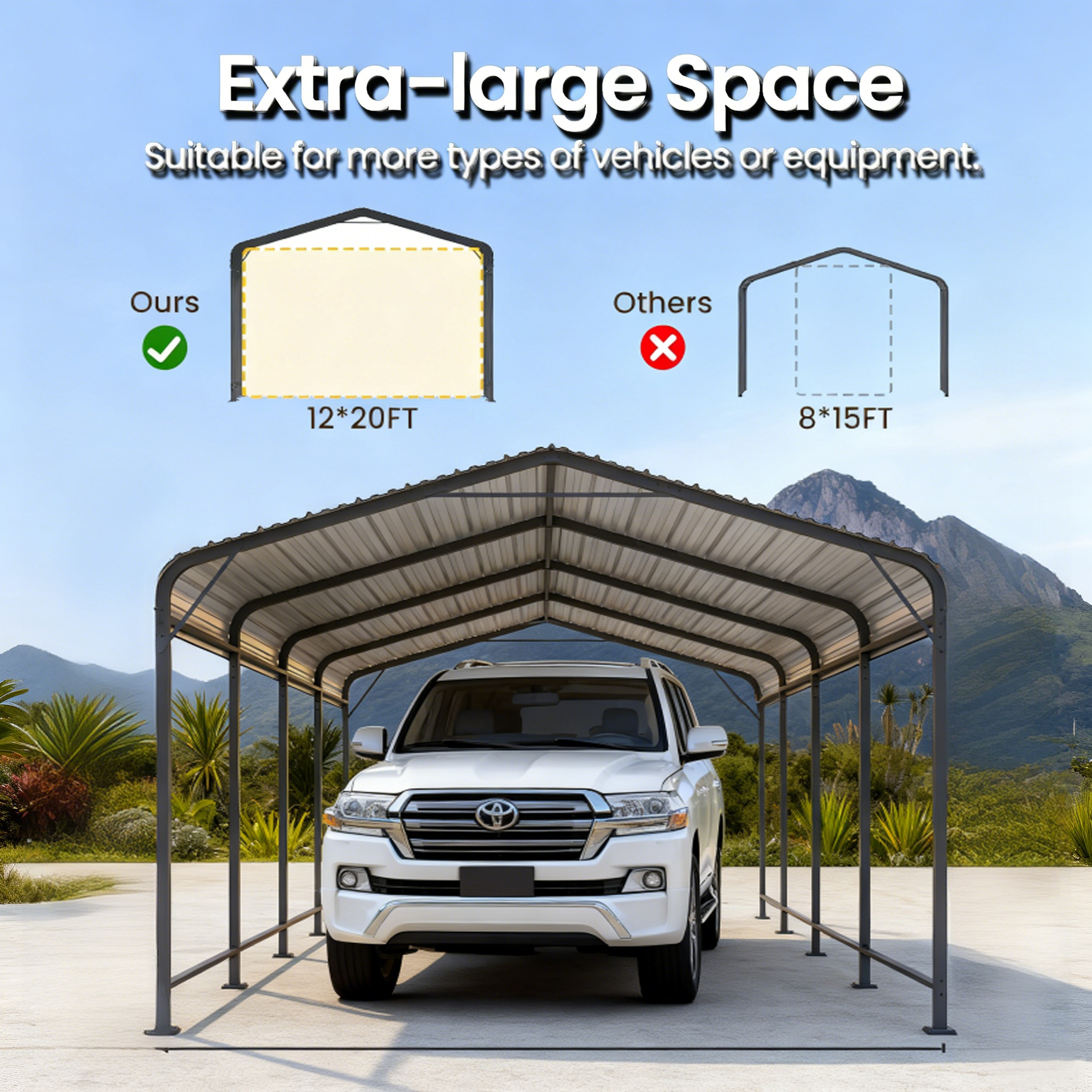 A: Our metal carport uses galvanized square steel tubing with corrosion-resistant coating, designed for heavy duty carport applications and long-term outdoor protection.